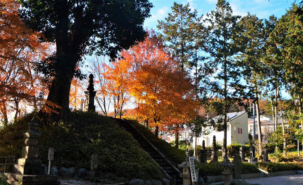 この寺には、大正13年に県指定史跡になった家康の子頼房の養育にあたった中山信吉の墓(4mの盛り土の上に高さ3m余の宝筺印塔)や昭和33年に県指定古文書になった中山信吉木碑(欅づくり、亀座の上に高さ151cm、幅47cm)があります。